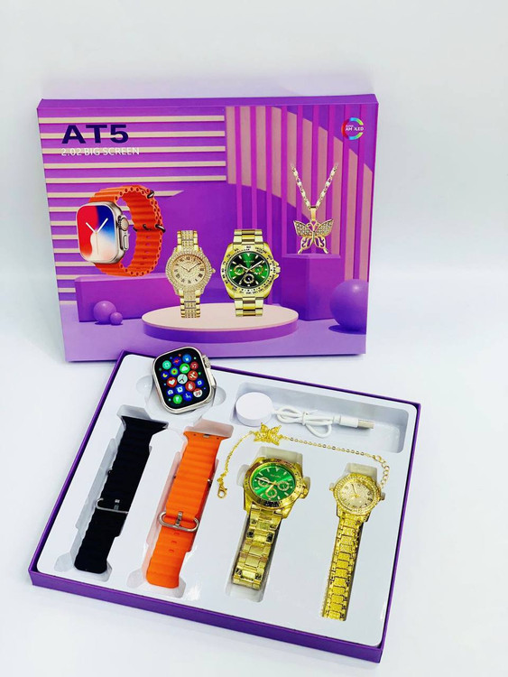 ست و پک ساعت هوشمند مدل AT5 بسیار شیک مخصوص کادو... ۳عدد ساعت زنانه و مردانه و گردنبند(((با قابلیت های فراوان)))با منو متفاوت...پیام.تماس .موزیک. و... اندازه گیری فشار خون ، ضربان قلب، اکسیژن خون ، قدم و ...